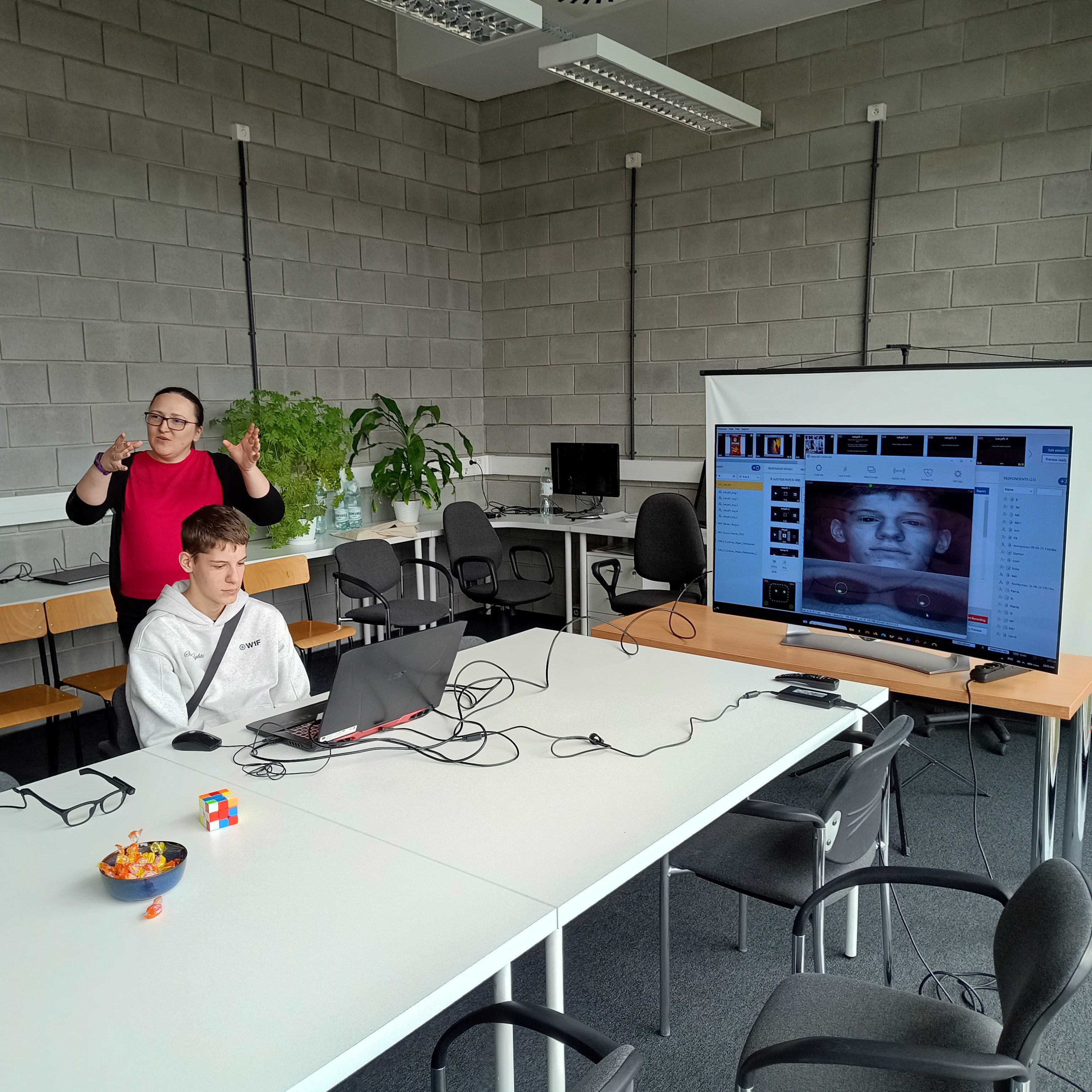 During the workshop, participants had the opportunity to gain hands-on experience with eye-tracking technology and learn about its applications in various fields of science and everyday life. The students took part in an experiment conducted using a stationary eye tracker, which allowed them to observe how eye activity is recorded in practice.