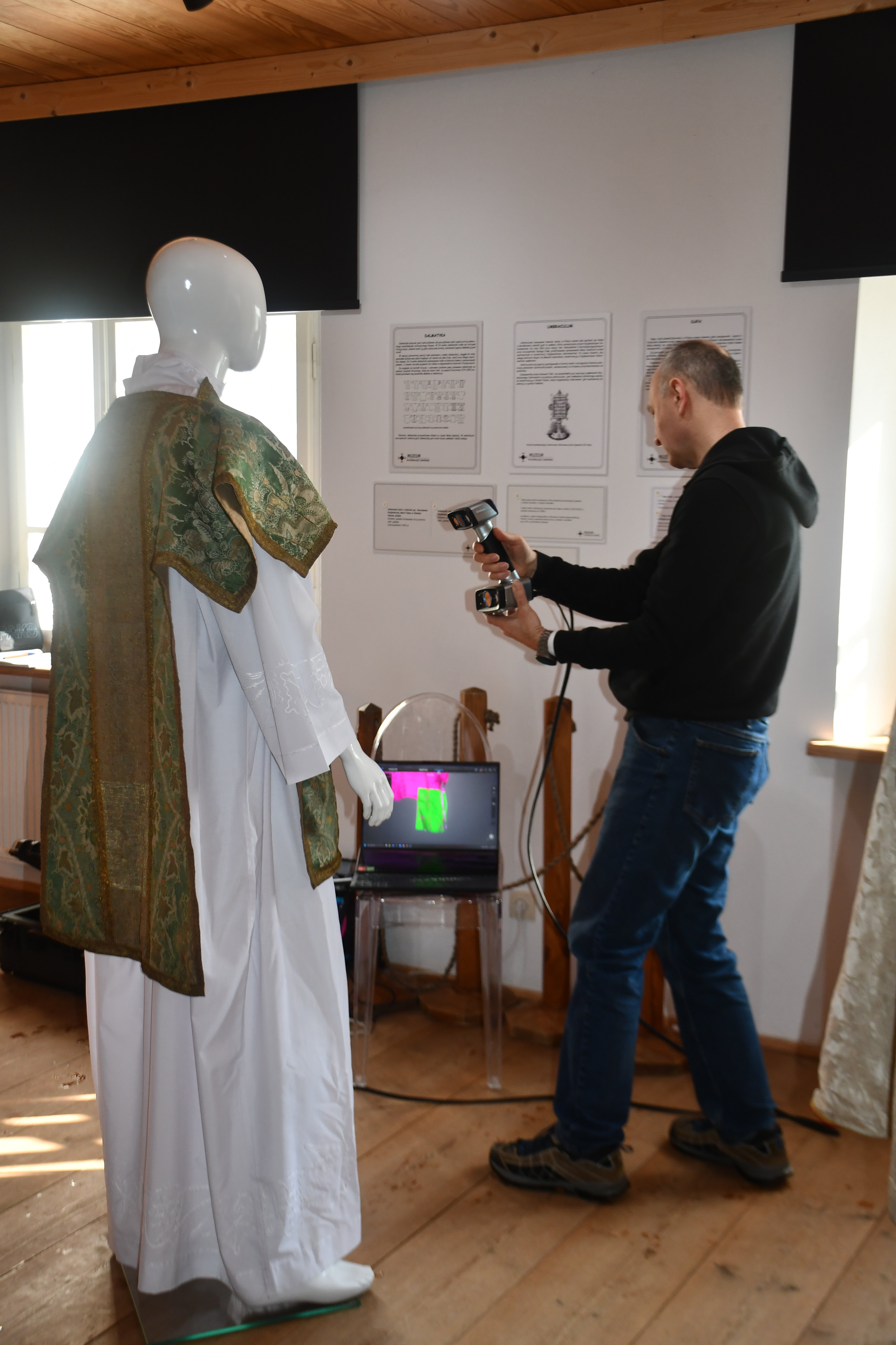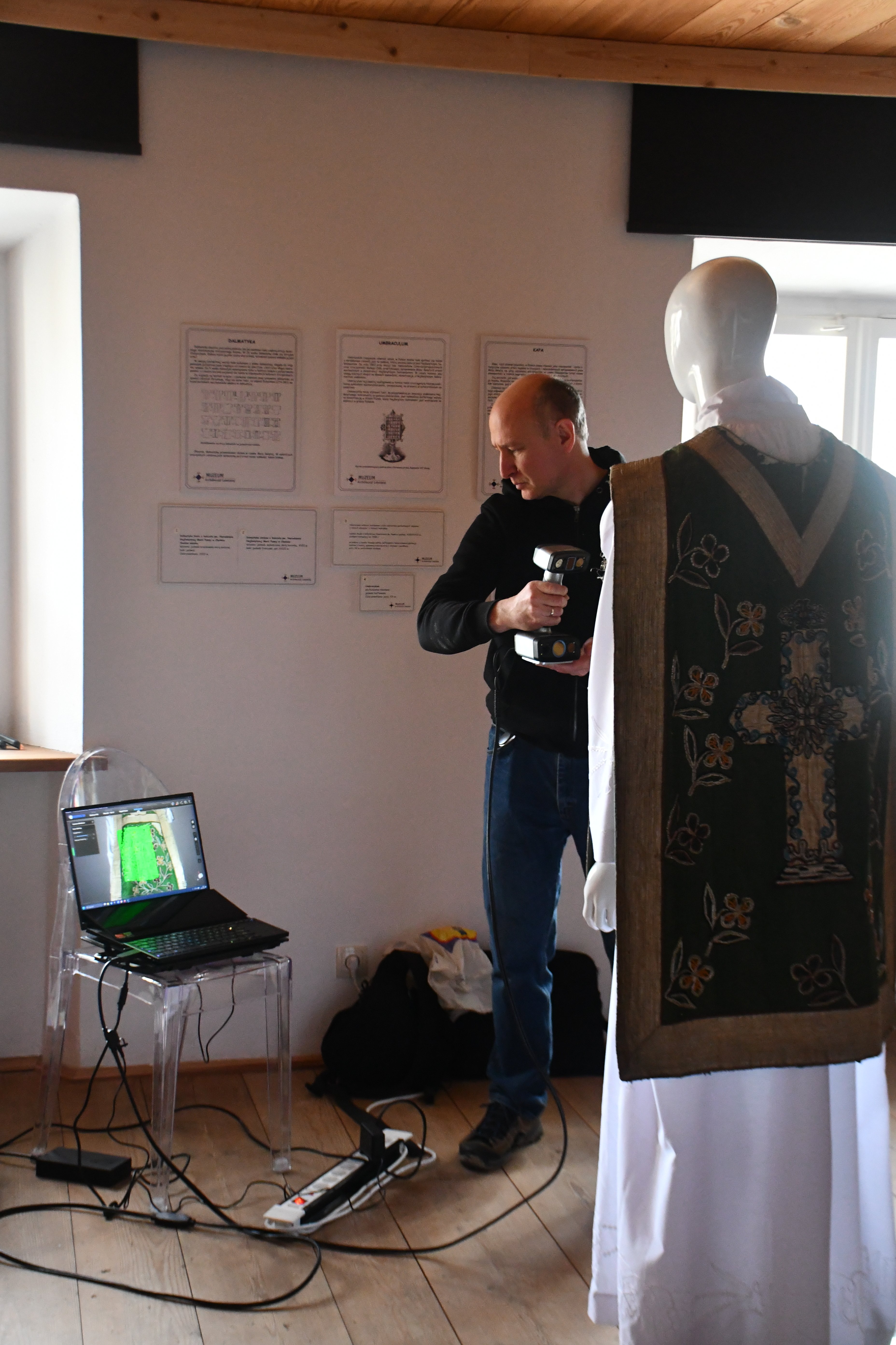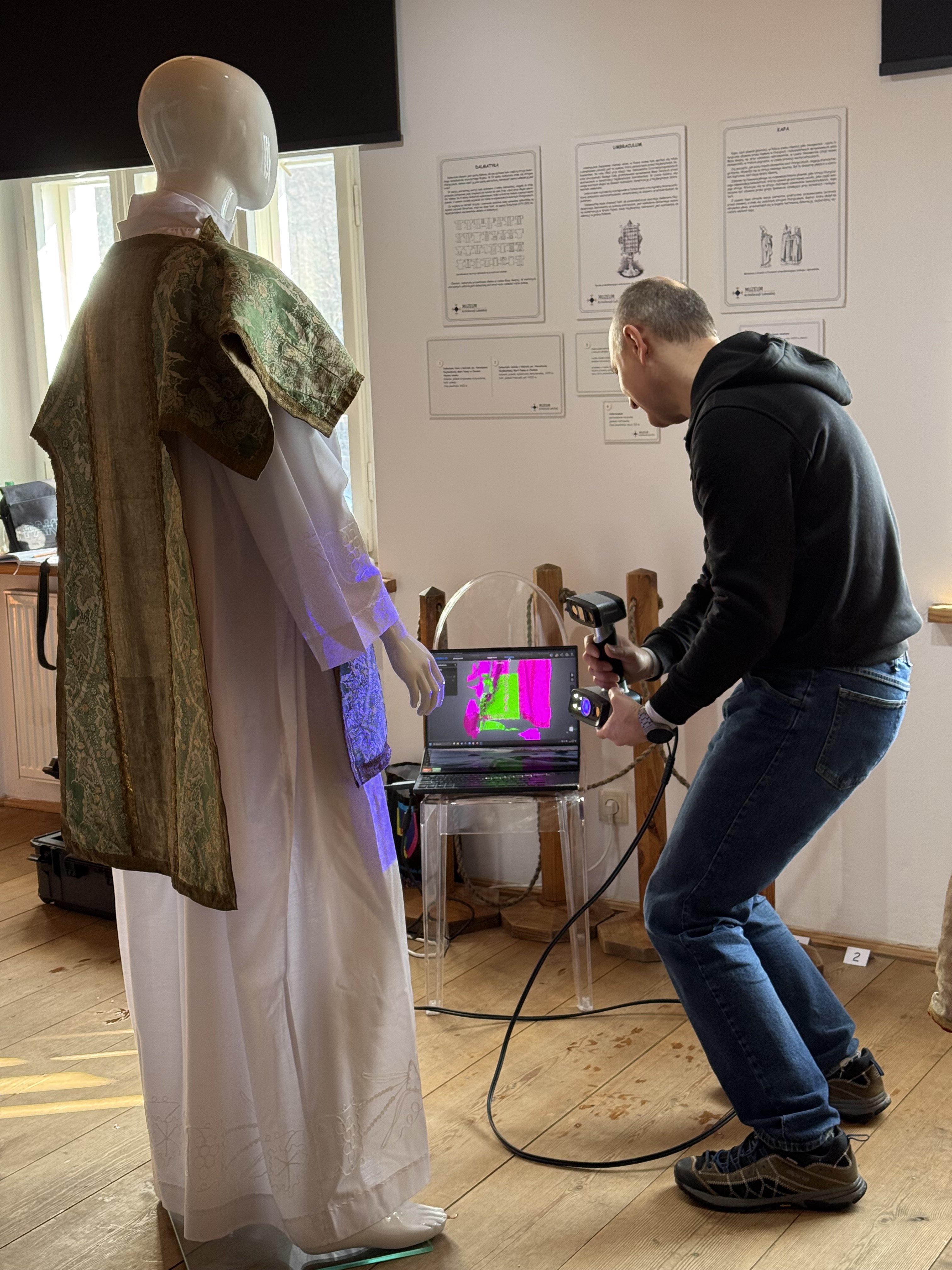 Pracownicy Katedry Informatyki związani z „Lab 3D” w składzie prof. uczelni Jerzy Montusiewicz oraz adiunkci: Jacek Kęsik i Kamil Żyła prowadzili trójwymiarowe skanowanie zabytkowych szat liturgicznych i innych akcesoriów liturgicznych wykonanych z haftowanych tkanin. W Muzeum Wsi Lubelskiej została zorganizowana czasowa wystawa pt. : „Tkaniny – ukryte piękno” ze zbiorów Muzeum Archiwizacji Lubelskiej. Skanowanie przeprowadzono w lutym 2026 r. w trakcie trzech wizyt studyjnych. Akwizycję danych wybranych eksponatów wykonano w 3. różnych technologiach: Structured Light Scanning (SLS) – 33 GB, Close-Range Photogrammetry (CRP) – 1,6 GB oraz Light Detection and Ranging (LiDAR) iPhone – 330 MB. Do skanowania SLS wykorzystano nowo zakupiony skaner EinScan HX firmy Shining 3D, do CRP – aparat Nikon D7500 z obiektywem o zmiennej ogniskowej Nikkor AF-S DX 18-140mm f/3,5-5,6G ED VR, zaś do LiDAR model telefonu iPhone 16 PRO MAX. Wynikiem przeprowadzonych działań grupy było wykonanie skanów 3D: 3. kap liturgicznych z XVIII i z XIX w., 2. dalmatyk (szata noszona przez diakonów) z XVII i XVIII w. oraz 4. ornatów pochodzące od XVIII do przełomu XIX/XX w. Ponadto wykonano skany dwóch umbraculum (przesłona z haftowanej tkaniny naciągnięta na ramę) oraz sukienki na puszkę.