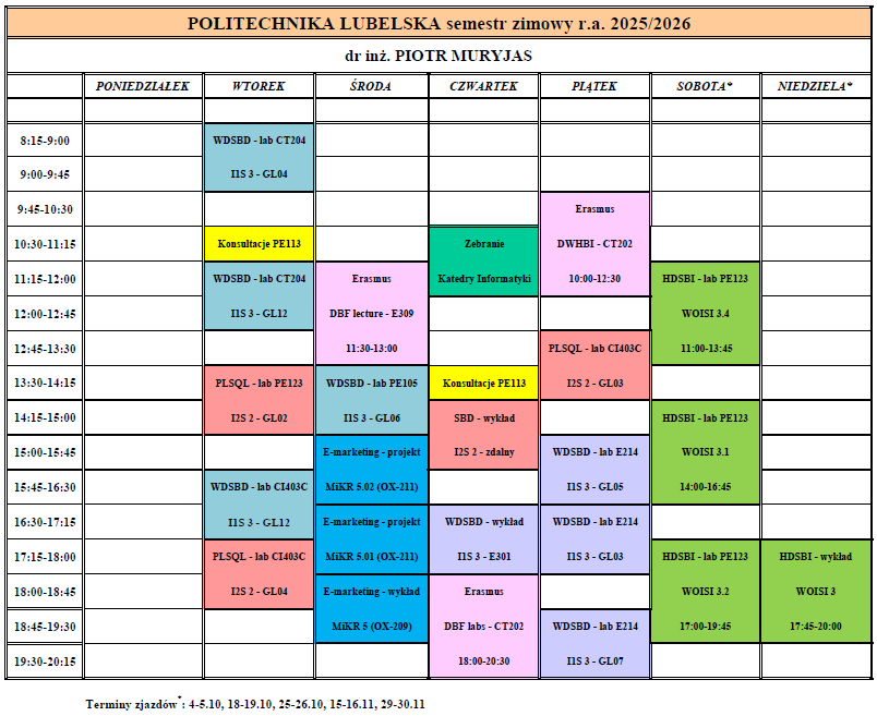 Godziny kontaktowe ze studentami w semestrze zimowym r.a. 2025/2026 (pokój PE113 Katedra Informatyki):