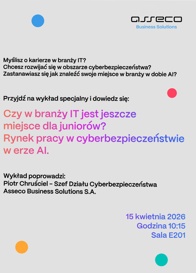 Zapraszamy na wykład „Czy w branży IT jest jeszcze miejsce dla juniorów? Rynek pracy w cyberbezpieczeństwie w erze AI”, który odbędzie się 15 kwietnia 2026 o godzinie 10:15 w sali E201.
