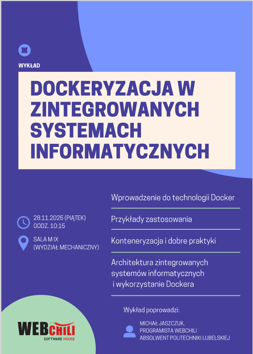 Zapraszamy w dniu 28.11.2025 (piątek) o godzinie 10:15 do sali M IX (Wydział Mechaniczny) na wykład “Dockeryzacja w Zintegrowanych Systemach Informatycznych”, który poprowadzi pan Michał Jaszczuk z firmy WebChili.