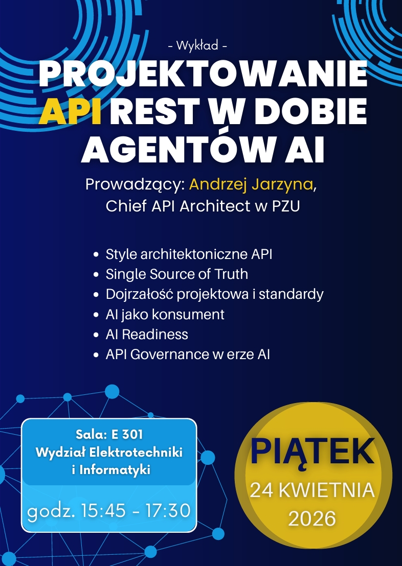 Zapraszamy na wykład „Projektowanie API REST w dobie agentów AI”, który poprowadzi pan Andrzej Jarzyna, Chief API Architect w PZU. Wykład odbędzie się w piątek, 24 kwietnia, w godzinach 15:45-17:30, w sali E301.